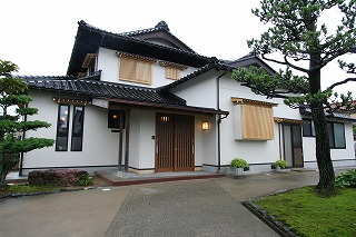 リフォーム後![]() 外壁は白のサイディングとし、瓦は地場産の「小松瓦」を新たに葺きかえた。「加賀庇」と呼ばれる地域に伝わる細工の庇とし、格子をあしらい重厚で風格ある古民家を再現させた。 |