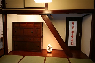 リフォーム後![]() ゲストを迎える床の間。壁は珪藻土に塗り替え、外国人が快適に寛げるように座卓に合わせ掘りごたつ式とした。 |