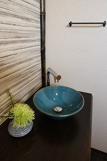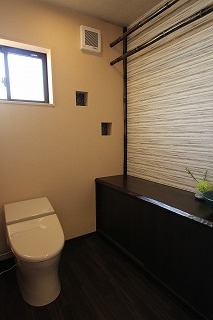 リフォーム後![]() ポイントクロスにアクセントの黒竹、収納の無垢板天板が和の空間を演出。 ![]() 手洗いボウルは陶磁器の持つ美しいデザイン、色味が和空間にマッチしています。 ![]() 2Fトイレ。オレンジ×こげ茶の配色がカジュアルな印象です。 |