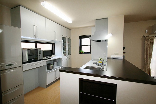 - キッチンの対面部分には、ご家族が使えるパソコンコーナーや新聞や雑誌が収納できるマガジンラック、広い配膳カウンターを兼ねた地袋収納等、奥様が使いやすいように配慮しました。