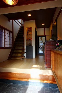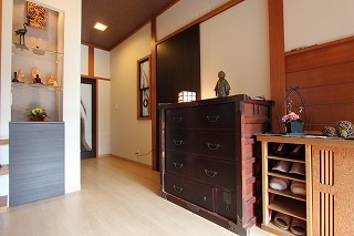 リフォーム後![]() 段差のあった玄関は式台を設け、上り下りも楽になりました。 ![]() 納戸にあった想い出の和箪笥を玄関ホールに。 |