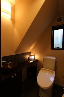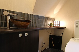 リフォーム後![]() 寝室から近い位置にトイレを設けました。 ![]() 手洗いカウンターまわりにはモザイクタイルを貼りました。 |