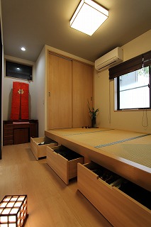 リフォーム後![]() 小上がりになっている寝室からは、昔息子さんが植えた木を眺める事ができます。 ![]() 小上がりの下は引出収納となっています。 |