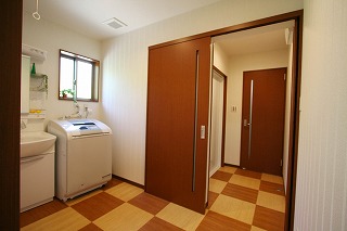 - 脱衣室、ユーティリティは、おばあちゃんの部屋からも、ご夫婦の寝室からも行き来できるので、洗濯を干したり、片付けたりとても便利に使え、お孫さん達と一緒にお風呂に入る時も、脱衣室、ユーティリティが広いのでゆったり着替えができます。