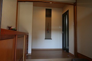リフォーム後![]() 玄関ホール正面には飾棚を設け、空間のポイントに...。既存の下足入れはそのまま再利用しました。 |