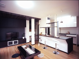 リフォーム後![]() 白と濃い茶色のコントラストがモダンな印象のLDK。テレビ側の下がり天井がアクセントとなっています。 |