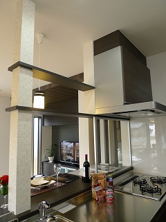 - キッチンと食器棚の間隔にゆとりをもたせたので親子でお料理もできます。またコンロ前はガラスになっているので、料理をしながらも皆の様子がわかります。