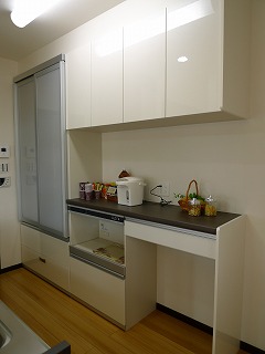 リフォーム後![]() カウンターを設け、配膳の楽な食事スペースも確保しました。 ![]() 抜けない柱を利用して飾棚を設けました。コンロ前もガラスになっているので、お料理をしながらでも皆の様子がわかります。 ![]() キッチンと食器棚の間隔にゆとりをもたせたので、親子でお料理もできます。 |