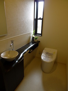 リフォーム後![]() 全体的にスッキリとした印象のトイレ空間。栗の手洗いカウンターと手洗いボウルがポイントです。水のはねるところにはパネルを貼り、お手入れも楽になりました。 |