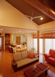 - LDK、フリースペース、ウッドデッキと広々した空間に、リビングの梁を出した勾配天井で更に開放感がアップしました。