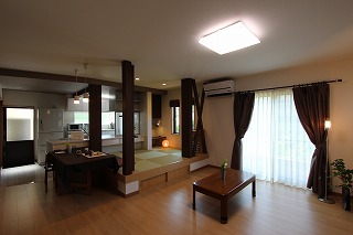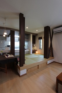 - 増築により必要となった耐力壁と柱をデザインに組込み、念願の小上がりの畳スペースでゆっくりと寛げるLDK空間となりました。