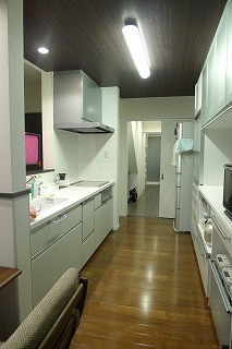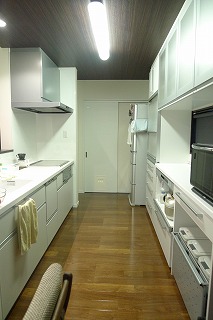 リフォーム後![]() 対面式となりコミュニケーションもとれます。収納も充実の使いやすいキッチンです。キッチン~ユーティリティ間の建具には愛猫用のペットドアを取付ました。 ![]() 建具をあけるとユーティリティ、洗面脱衣、浴室と一直線につながります。 |