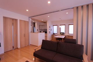 広いLDKとなりました。使い方によってリビングとダイニングキッチンを仕切れるのでとても便利です。