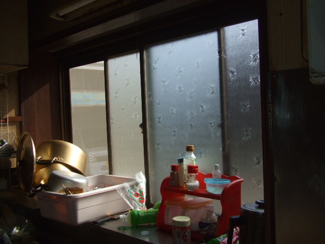 リフォーム後![]() キッチンを北側に配置して水まわりを集中させました ![]() キッチンの小窓からはリビングの様子を見ることができます ![]() キッチンから洗面脱衣室に繋がる建具にはステンドグラスの明かり採り |