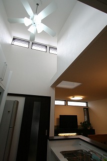 - 両横に隣家が迫り、明りの取れないキッチン上部は吹き抜けとし、上部から採光を取り入れ、明るいLDKを実現しました。