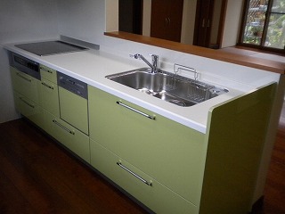 リフォーム後![]() 奥様の好きな緑色のキッチン。リビングの様子もわかるので、お料理をされながらコミュニケーションがとれます。 |