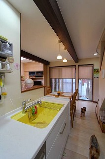 リフォーム後![]() シンクのイエローがポップな印象のキッチン。ご家族とひとつの空間で、お料理をしていても、コミュニケーションがとれます。 |