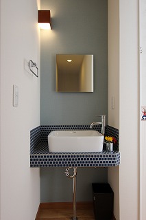リフォーム後![]() 2階でも顔を洗えるよう洗面コーナーを設けました。ポイントクロスとタイルのカラーがクールな印象。ミラーボックスと陶器の手洗いボウルがシンプル&スタイリッシュな空間を演出。 |