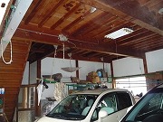 リフォーム後![]() 母屋と納屋を渡り廊下でつなぐ為、入母屋和風の母屋と一体感をもたせました。また納屋部分1階の車庫の出入り口を通りに面した東面に変更しました。 |