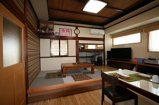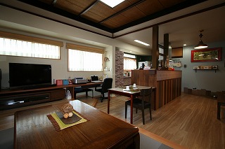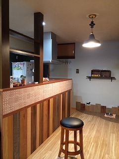 リフォーム後![]() ワンフロアのLDK。既存の和風天井も自然に馴染みます。 ![]() キッチンカウンターには在庫のフロアタイルを活用し、レトロカフェ風の仕上がりになりました。 ![]() LDK一角に愛犬用のスペースを設けました。デザイン性+お手入れ面も考慮しました。 ![]() 落ち着く小上がりの畳スペース。小上がり部分は収納となっています。 |