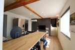リフォーム後キッチンカウンターに設けた収納棚にはお子さんのランドセル学校で使うものなどを入れられ、片付ける習慣が身に付きます。 梁をあらわしとすることで天井高を確保しました。 |