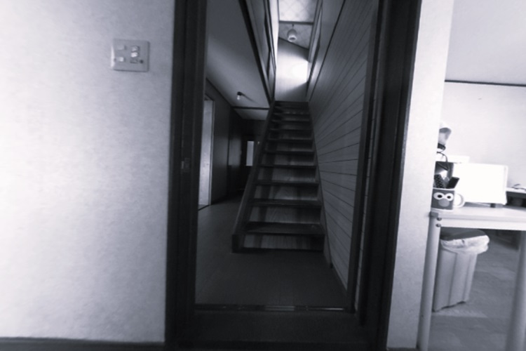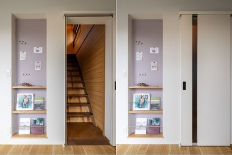リフォーム後![]() 温まった熱が上に上がらないように片引き戸を設置 ![]() 壁に近い色の扉で階段の存在感をなくした |