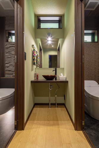 - ランドリールームの畳コーナーや既存の床柱、足触りの良いフロアなど、和の心地よさを感じられるポイントをつくり、旅館の雰囲気を演出した。